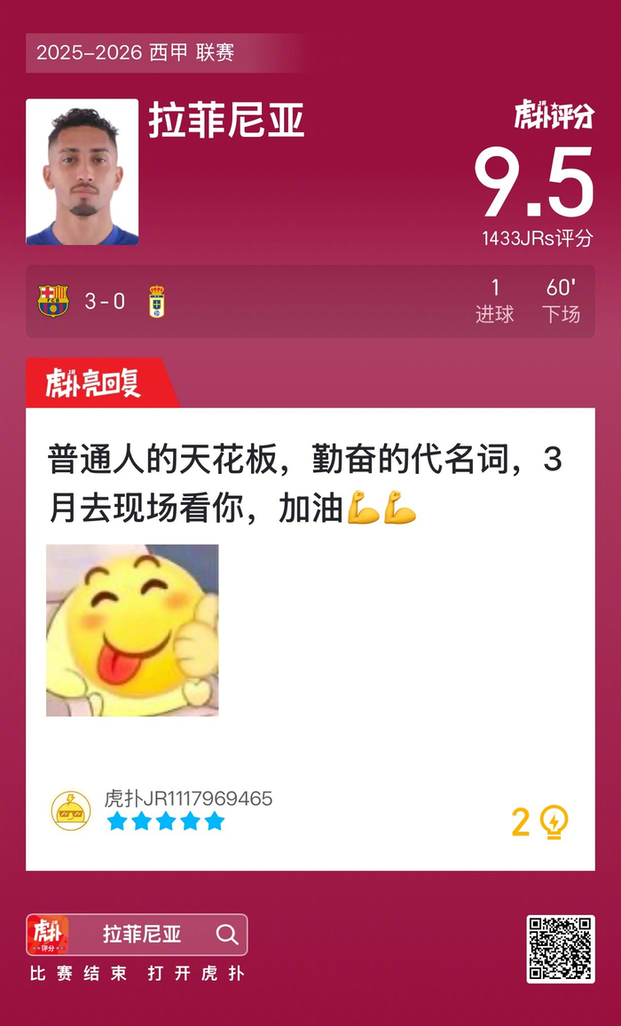 #巴萨3比0皇家奥维耶多# 拉菲尼亚打进一球,赛后收获9.5的虎扑评分! 发布于:山东...